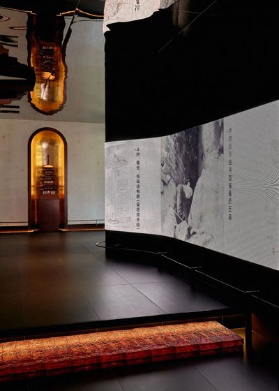 设计师将应县木塔意向为墙面壁画,让镂空的塔身在光影虚实中呈现。墙壁上展示的梁思成与林徽因的手稿切页,传递中国古建的智慧。