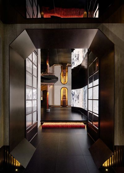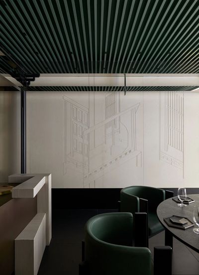 ,走入前厅半亭半殿的复长廊之中。墙壁上的数字卷轴展开,梁思成与林徽因的建筑手稿流动呈现,成为这座餐厅的美学起点。