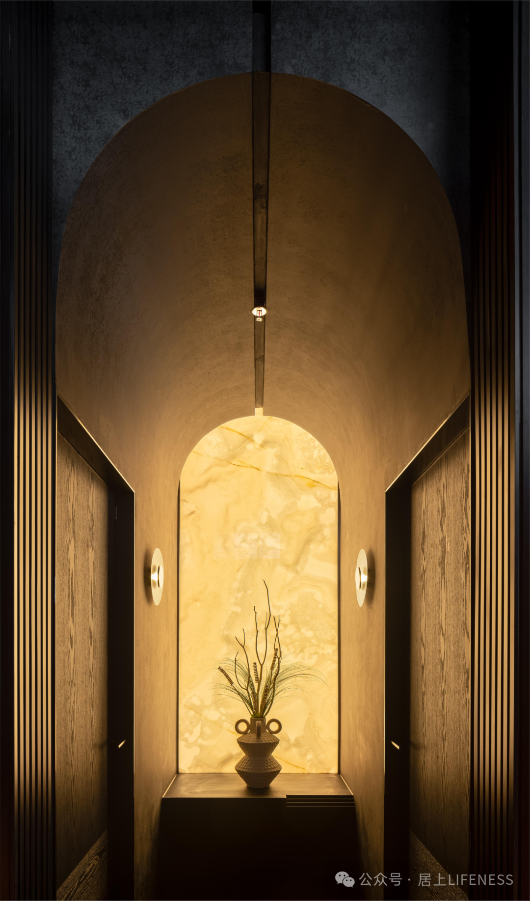 古建元素也通过艺术化形式融入到吊灯与桌面摆件之中,斗拱的美学特征再一次被扩充进当代日常。