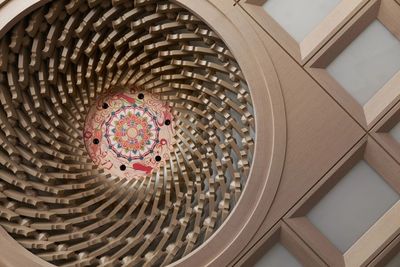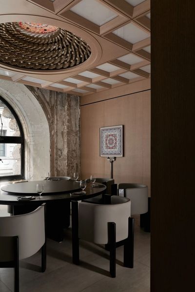 藻井不仅仅是室内顶部的装饰,更是古人天人合一哲学的具象化表达。建筑师将天花“平棊天花”井格形式,以凸显餐桌上方的螺旋状藻井。