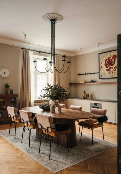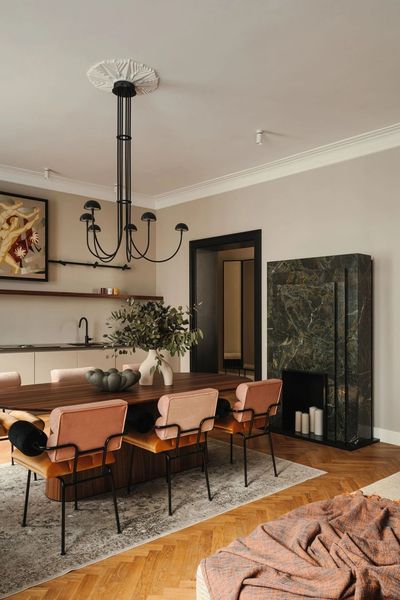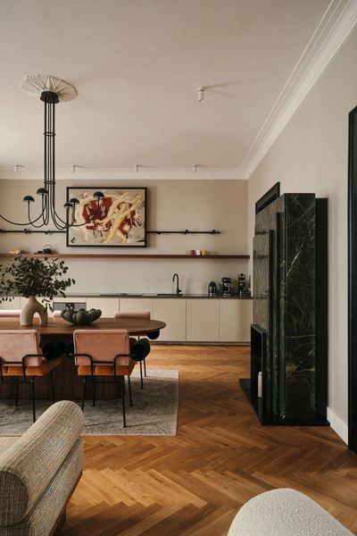 天花板上的浮雕装饰与圆形花饰,以及高挑的空间层高,显出这套公寓原本的特质。设计师用少量装饰元素来突出这种优雅感,如此一来,便能充分领略每一件元素的独特美感。