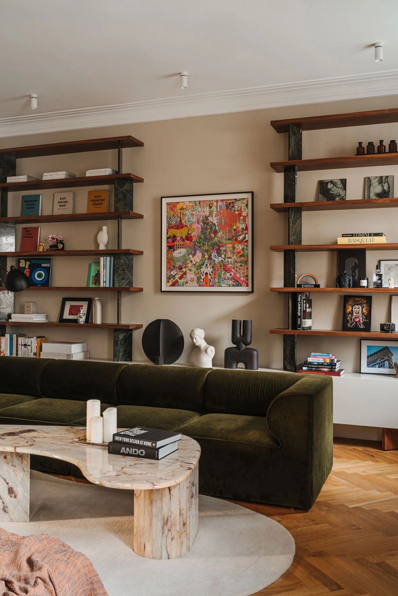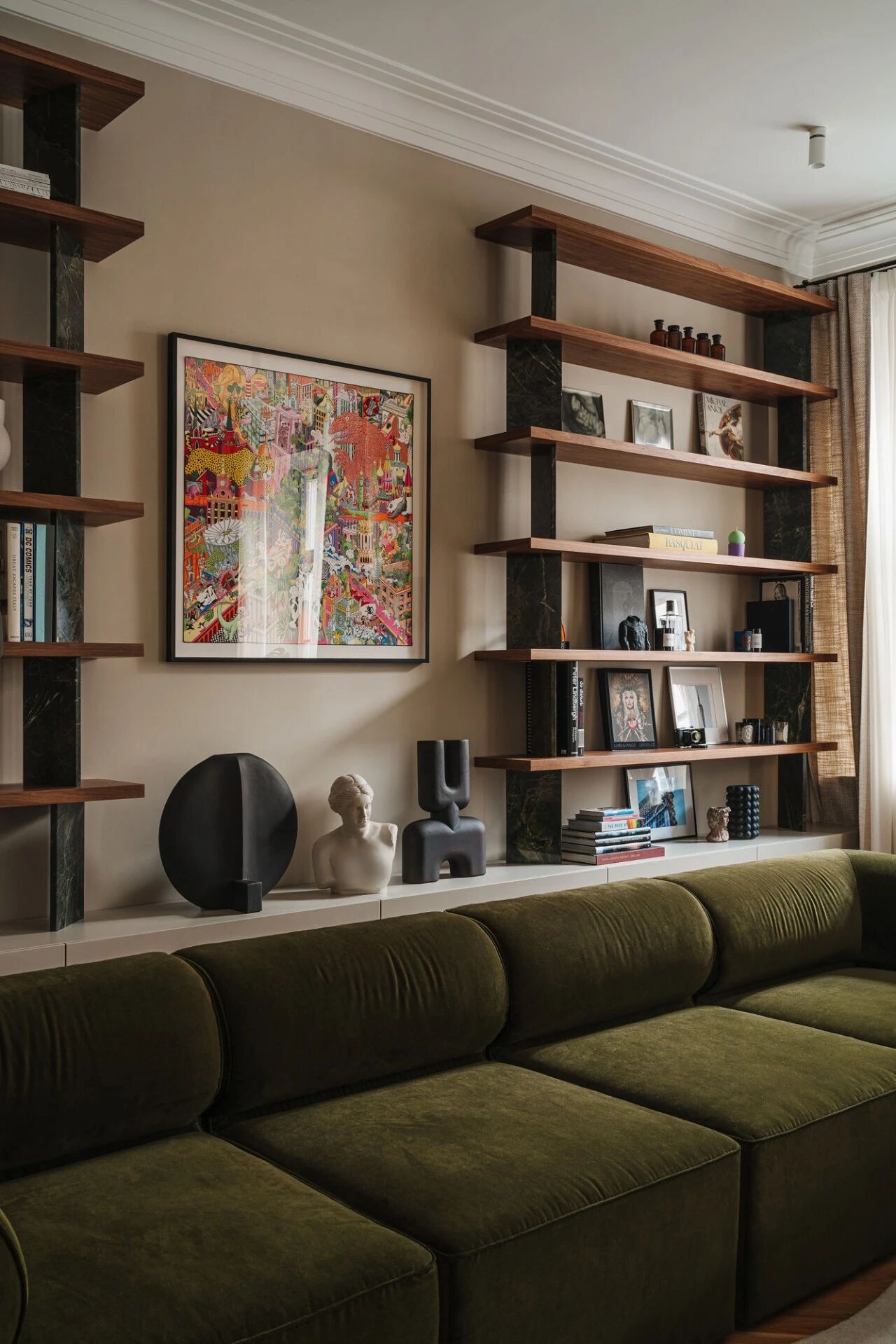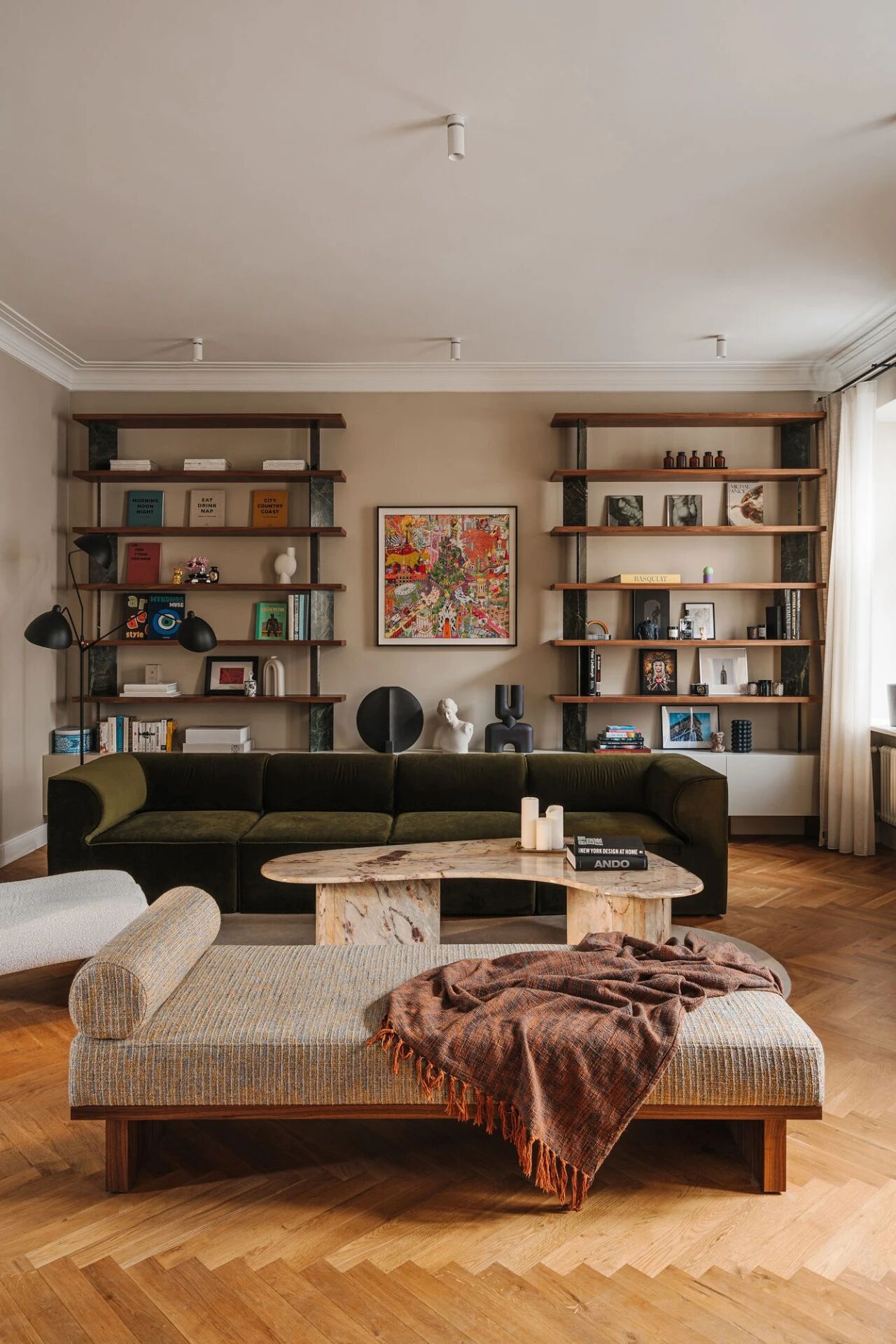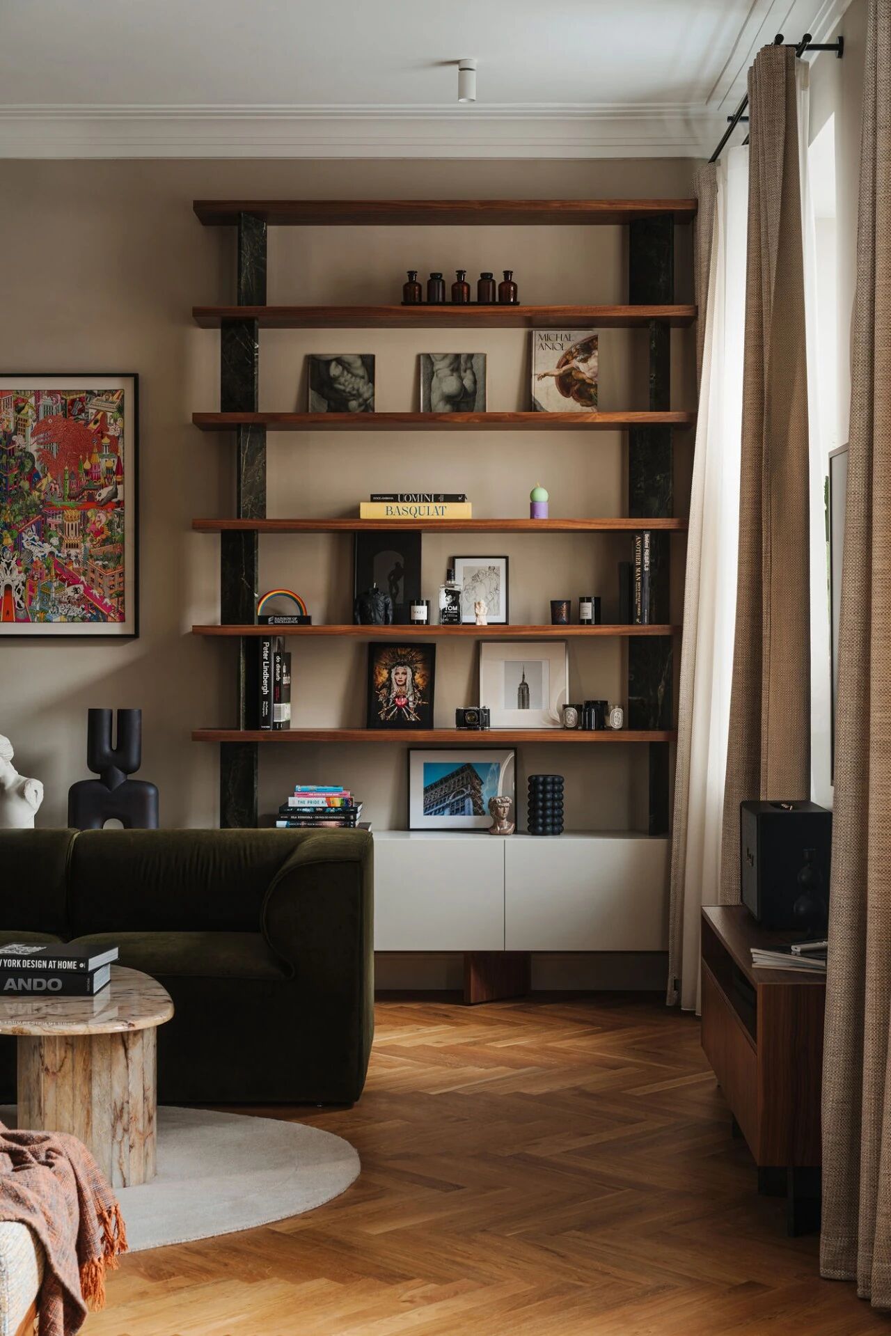 公寓由层次丰富的色彩与风格构成,其基调是浅米色的墙面,为空间奠定了经典优雅的氛围。在这温暖的底色之上,木材、金属与石材等材质打造出更为鲜明的亮点,为整体空间增添了细腻的质感与张力。