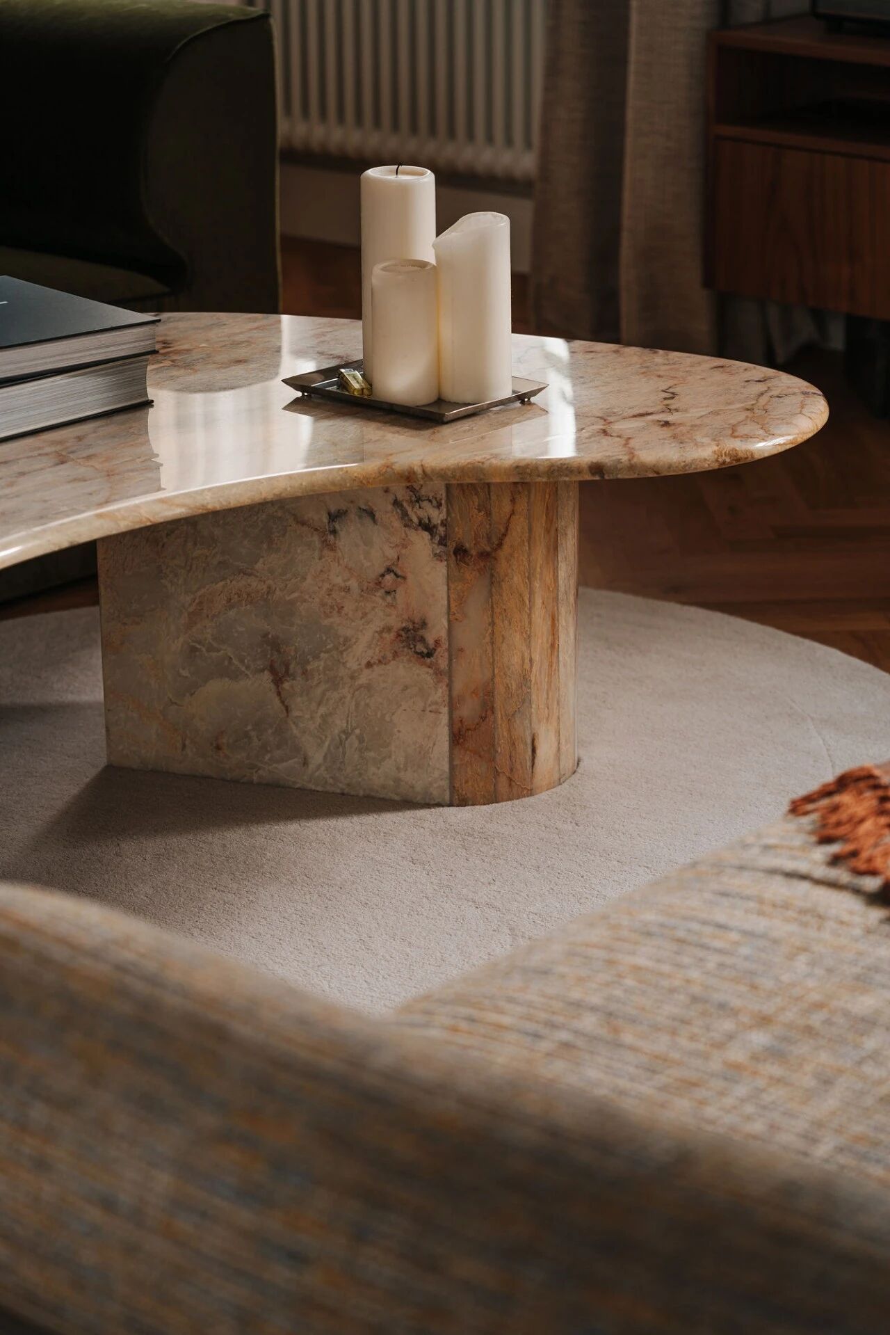 日间活动区的核心的沙发采用绒面织物包裹,搭配胡桃木材质装饰件。一面墙被大型书架占据,既提供了充足的储物空间。一张大理石咖啡桌与扶手椅,为空间增添了完整感。