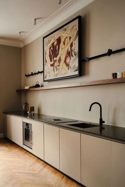 厨房选用了Boffi的橱柜,并搭配一块简约的胡桃木单置物架。一幅画作悬挂在料理台上方,为整个厨房空间作了完美收尾。餐厅区域的核心是一张厚实餐桌,上方悬挂着一盏吊灯,黑色大理石灯罩尽显质感。