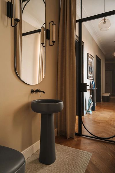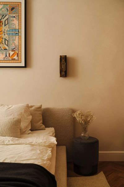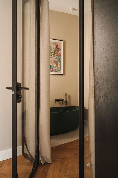 卧室则是一处静谧的休憩港湾,配备了米色布艺饰面的床具、复古壁灯,以及一条爱马仕披巾。浴室的核心是深绿色独立式浴缸,地面部分铺设橡木拼花地板,而在湿度较高的区域则采用了大理石马赛克。