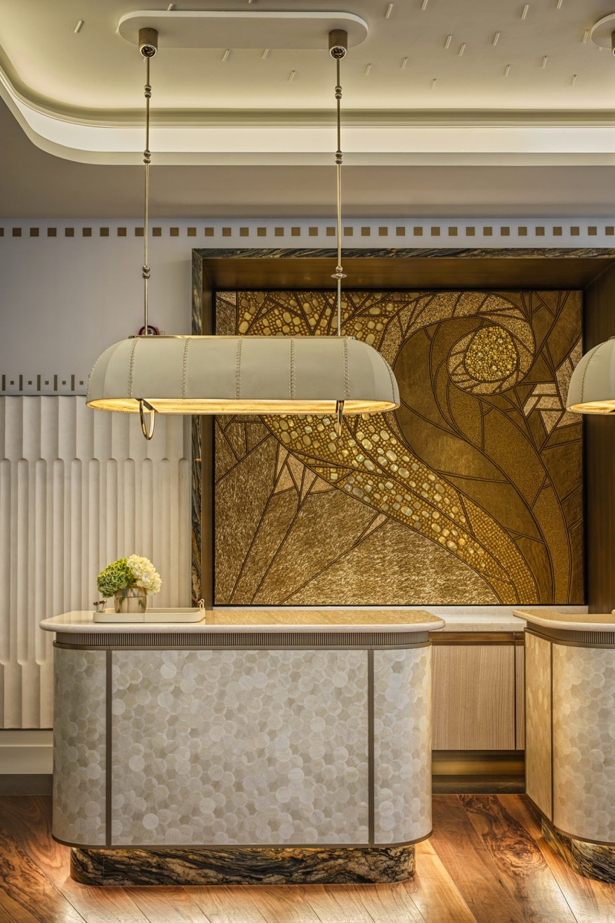 De Malsche标志性的设计手法——运用原生态材质、手工细节与传统工艺,塑造出沉静而持久的优雅氛围。穿过玄关步入宅邸,宾客视线自然被楼梯上方巨窗框起的花园景致吸引。起居区玻璃地板镂空设计,可俯瞰下方车库——主人珍藏的汽车在此陈列展示。作为雕塑元素设计的石灰华壁炉,其玻璃隔断既延续了与车库的视觉联结,更赋予空间更深邃的纵深感。